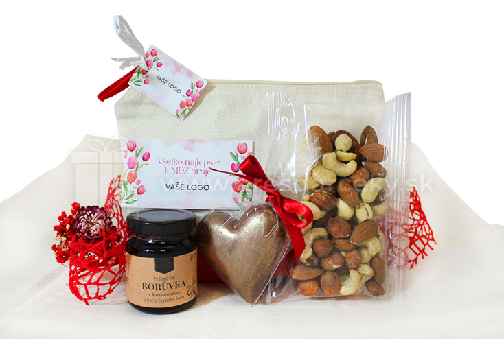 - srdiečko s krémom z mandlí a mliečnej čokolády, balené v celofane s mašľou, nálepka s Vaším motívom